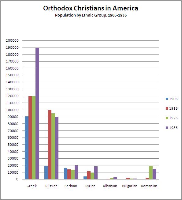 As you can see, the 1916-1926 period was rather stagnant; in fact, aside from the Albanians and Romanians, every jurisdiciton declined in that period. World War I probably had something to do with it, as well as the new immigration quotas imposed by the US government in 1924. It’s also likely that the various jurisdictional schisms of the 1920s — Russy-Antacky, Royalist-Venizelist, Metropolia-Living Church — affected the ability of the Census Bureau to collect data. (That is, there were probably more Orthodox than were reported in 1926.)