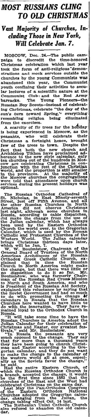 After reading Matthew Namee’s recent post on the celebration of Christmas according to the New Calendar in Orthodox parishes and jurisdictions in America during the first half of the 20th century, I thought it appropriate to post an article that appeared in the pages of the New York Times on December 25th, 1923.