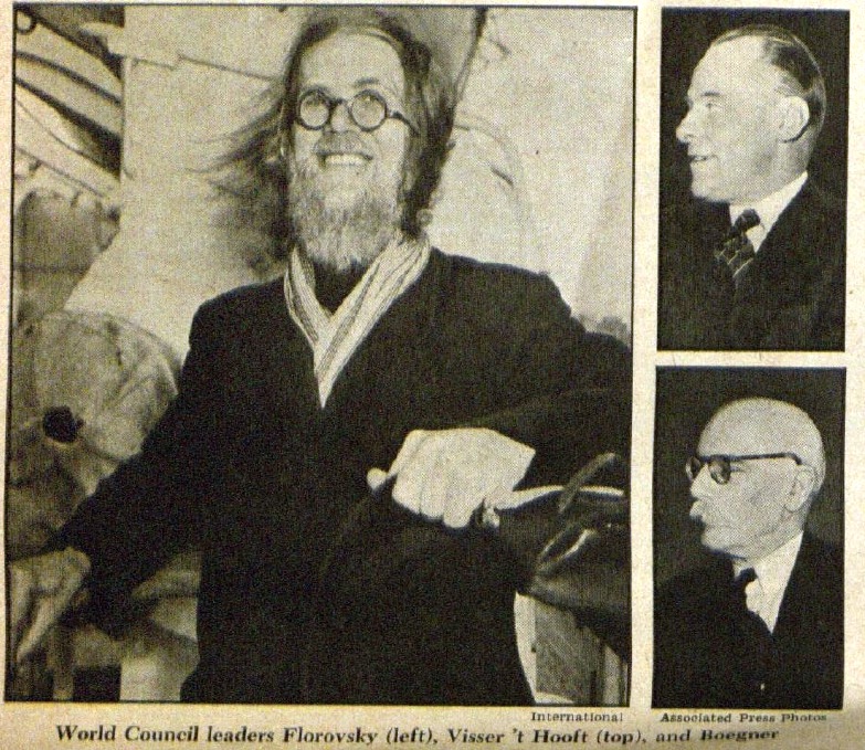 The meeting of the provisional committee was held in Buck Hill Falls, Pennsylvania, on April 22-25, 1947. There it was announced that the first Assembly of the World Council of Churches would be held at Amsterdam from August 22 to September 5, 1948, having as its general theme “Man’s Disorder and God’s Design.” It is perhaps indicative of Florovsky’s influence that, already at this point, the WCC’s general secretary W. A. Visser’t Hooft emphasized to the press that the WCC was not to be understood as a “super-church” which would dictate to its member bodies, but only “an expression of the desire of the Churches to obey the will of their common Lord,” involving “not . . . the denial of the confessional heritage of the churches,” but rather “the attempt to manifest that unity which has actually been given to churches that take their confessions seriously” (“Progress Report for the World Council: Provisional Committee Holds First Meeting in United States,” Federal Church Bulletin, Vol. XXX, No. 5, May 1947, 6-7).
