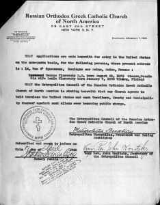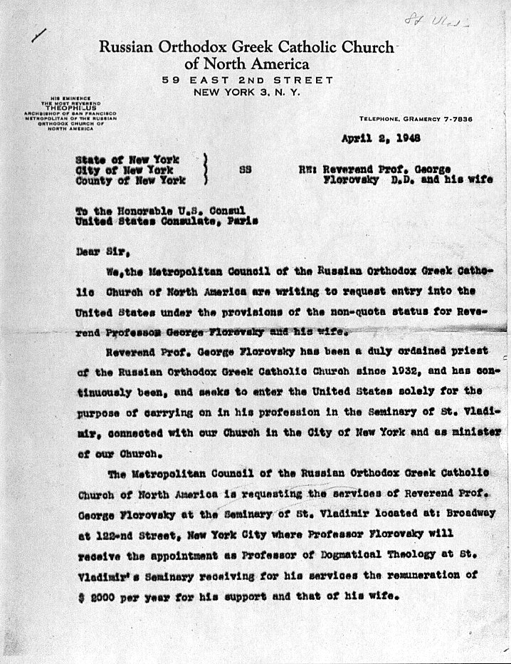 Following the conclusion of the provisional committee meeting, Florovsky traveled to New York in May 1947 to discuss the possibility of his coming to teach at St. Vladimir’s. The seminary was at this time housed in a cottage owned by General Theological Seminary (Episcopal Church USA), and had only a dozen students and limited faculty and resources. Florovsky spent most of his visit with Metropolitan Theophilus. The result of their conversations was that Florovsky agreed to accept appointment to the faculty, with the tacit understanding that he would later take up the deanship. Theophilus and Florovsky saw eye to eye both on the need to develop high-level theological education for clergy and to introduce the English language into teaching and church services. Almost exactly a year after Florovsky’s visit, on April 2, 1948, the Metropolitan Council of the Russian Orthodox Greek Catholic Church of America sent a letter to the American consulate in Paris requesting the entry of Florovsky and his wife into the US under non-quota status. Florovsky would later become a naturalized American citizen in 1954.