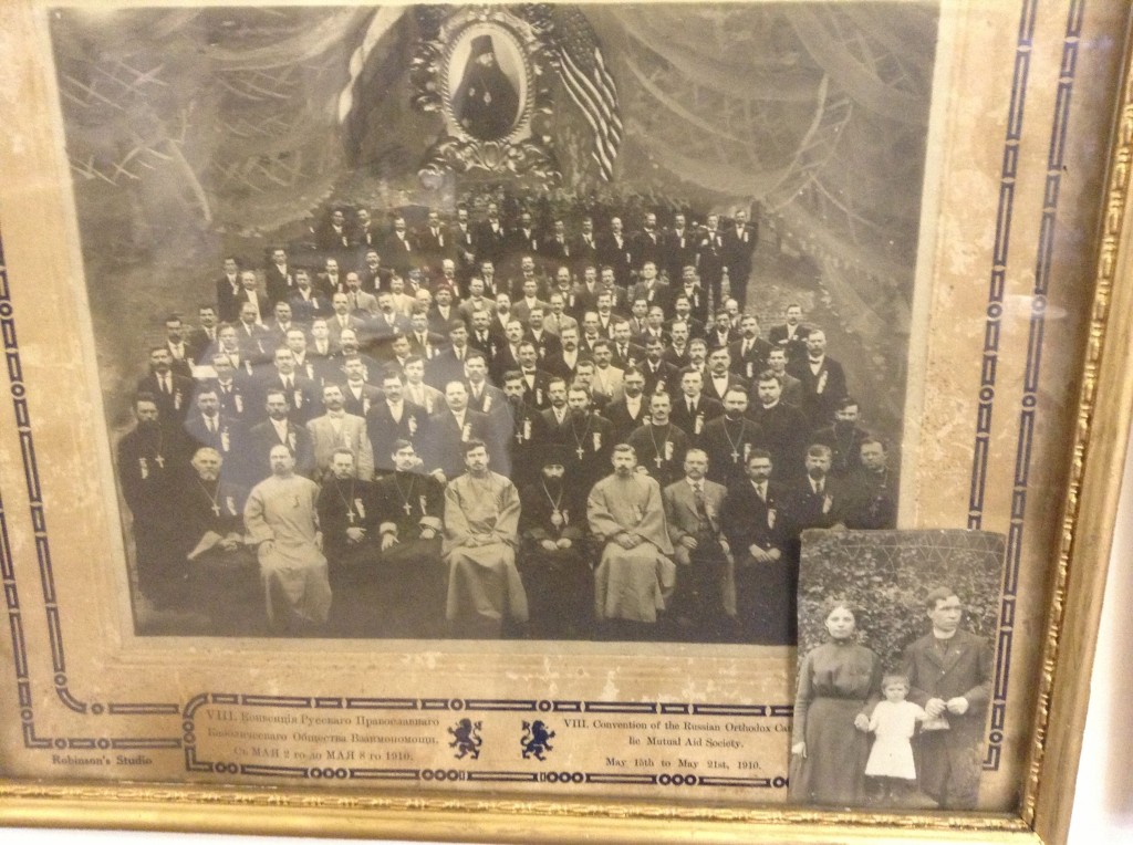 Over the past several months I have been traveling up to Hartshorn, OK to serve alongside the priest who is caring for the remainder of the the faithful at Sts. Cyril & Methodius. This month I took my iPad with the intention of photographing several items around the church (old ledgers & metrical books, icons, and photograph in the church hall. One of these photographs in particular I want to share with you. Its from 1910 and there are quite a few orthodox clergymen in the photo, as well as a bishop’s portrait at the top of the photo. I was hoping you could take a look at it and see if you can identify any of the clergy by sight. The priest near the center seated in the front row resembles pictures I’ve seen on your website of Alexander Hotovitzky. The bishop at the top reminds me of St. Raphael of Brooklyn, but you may know better.