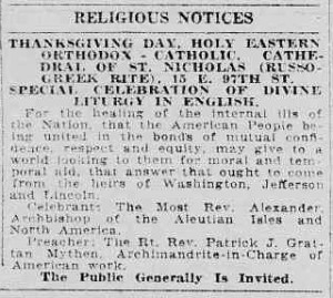 Thanksgiving Day as it is constituted as a civil holiday in the United States (and Canada) is not specifically found on the Orthodox liturgical calendar, but that doesn’t mean that Orthodox Christians in North America have ignored it. Here’s a notice from the New York Tribune for a Thanksgiving Divine Liturgy held at St. Nicholas…